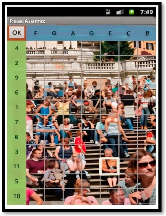 In 2018 [], Sun et al. presented PassMatrix in Figure 4, which takes advantage of the picture discretization algorithm. The registration process requires the user to choose many photos. Every choice has a corresponding letter on the horizontal bar and a corresponding number on the vertical bar. For every pre-selected puzzle, the user must move the letter to the column on the horizontal bar and the number to the row on the vertical bar. This procedure is iterated for every chosen image. The first chosen image’s random problems are then displayed. Every problem has a number at the vertical bar and a letter at the horizontal bar []. For every pre-selected puzzle, the user must move the letter to the column on the horizontal bar and the number to the row on the vertical bar. Each chosen image undergoes this process once more.