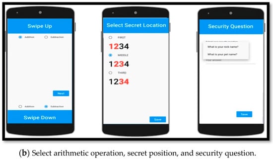 In 2022, Kausar et al. presented a hybrid authentication approach for smart devices. This approach combines text and graphical-based techniques, requiring users to determine four distinct options in order to generate a password. In Figure 10a, The four selections of GRA-PIN consist of choosing two-digit numbers, choosing one secret image, choosing the swipe-up/down position for arithmetic operation, and finally, choosing the password position in the final four-digit PIN. Additionally, in Figure 10b, the user is required to provide a secret answer in the event of forgetting the password. To enhance security against shoulder surfing, guessing, and camera attacks, a new password is generated each time the user logs in. Overall, this authentication technique offers enhanced reliability, security, and user-friendliness, all while maintaining usability and security [].