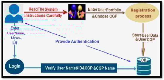 In 2023, Seksak, Hadier, et al. [] proposed a framework for web applications. A two-level multi-factor authentication system is utilized in Figure 13, incorporating both textual and recognition techniques. When users register, the system processes the information they provide and generates a unique, random number for them. The second user selects an image from CGP’s dataset or from their device. After the user selects an image, CGP resizes and blurs it before encrypting and storing it in the CGP database. The attacker argued that the image was not just a single element but rather a complex combination of five factors. The user-specified name, user ID, and an authorized image with appropriate characteristics such as name, size, and quality are among the considerations.