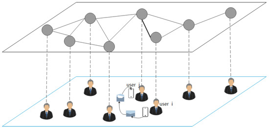 SAN (refer to Figure 1) leverages the social attributes of mobile carriers (i.e., subscribers) to design efficient network protocols. It represents a new approach in Delay Tolerant Network (DTN) [8] and Opportunistic Network (OppNet) [9]. In terms of operating principle, SAN is similar to DTN and OppNet [10]. On the one hand, due to the dynamic topology caused by nodes’ mobility within the network, there is a lack of stable end-to-end communication paths between the source and destination nodes. When the link between nodes is disrupted, the conventional routing methods fail to forward message data, and probabilistic encounters are often utilized to realize the forwarding in a multi-hop manner. On the other hand, during message forwarding, intermediate nodes typically use the “store-carry-forward” method to temporarily store messages [11,12,13], utilizing their short-range and low-cost devices to communicate with each other, thereby sharing data objects (such as pictures, advertisements, etc.) among nodes [7]. However, unlike DTN and OppNet, mobile devices in SAN are generally carried by objects such as humans, vehicles, and animals, which move to various places and engage in different activities, resulting in constantly changing network topology. Therefore, there are certain social attributes among nodes in SAN. It is extremely crucial to develop efficient solutions to motivate nodes to cooperate through these social attribute characteristics.