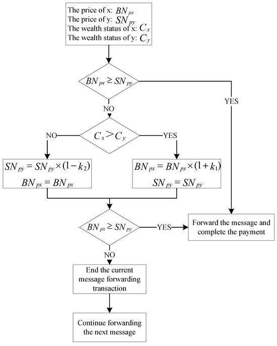 (2) After the transaction starts, the buyer’s wealth is the price of expenditure given by buyer x as B N p x ( h ) and the price given by seller y as S N p y ( h ) . If B N p x ( h ) S N p y ( h ) , then message m is successfully forwarded, and the next message can be forwarded. If B N p x ( h ) < S N p y ( h ) , the first negotiation forwarding fails.