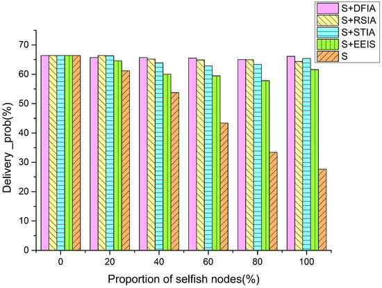 As shown in Figure 4, the probability of message delivery for the five scenarios with different selfish node percentages is depicted. The decrease in message delivery percentages can be attributed to the fact that selfish nodes do not participate in the forwarding cooperative behavior, which reduces the success rate of messages reaching the destination node. The overall trend indicates that the addition of selfish nodes results in DFIA, RSIA, and STIA acting as an incentive in the case of nodes with a selfish behavior. However, DFIA is more effective compared to RSIA and STIA. S has a more pronounced trend of decreasing message delivery rate as it does not use any incentives. RSIA focuses on the resource constraints and possible presence of high affluent nodes’ resource constraints and the possible impact of preferred selfishness on the network. STIA takes into account the quality of forwarding service of the nodes as well as the possible effects of short-term currency shortage in making decisions about nodes’ forwarding behaviors. EEIS uses node resource pricing and adopts the mode of equivalent exchange to carry out transactions. However, they do not consider the influence of location correlation between nodes and the influence of strong and weak social correlations between nodes. DFIA comprehensively considers the characteristics of node location and social correlations. Although its message delivery probability is 0.68% lower than RSIA when there are 20% selfish nodes, with the continuous increase in selfish nodes, the delivery probability of DFIA is higher than other algorithms. Based on the evaluation of the overall effect of the experiment, DFIA demonstrates the optimal performance in terms of message delivery probability.