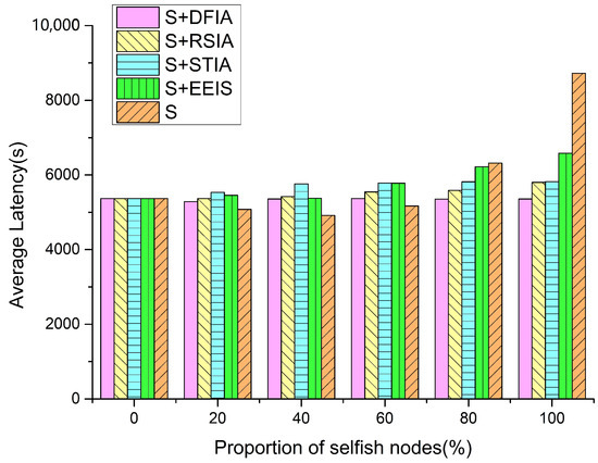 Figure 5 illustrates the average latency for the five scenarios with different proportions of selfish nodes. The increase in the average delay means that the addition of selfish nodes results in a longer time for message forwarding to the destination. The data presented in Figure 5 reveal that as the proportion of selfish nodes increases from 0% to 100%, the average latency increases in all scenarios, with varying degrees of increase. S has the most significant increase in average latency, especially when the proportion of selfish nodes reaches 60%; its average latency value increases dramatically because no incentive measures are adopted. In the remaining four scenarios, the increase in average latency is relatively smooth and does not appear to rise sharply. Among them, the average latency of DFIA is the most stable, and its average latency is lower than that of RSIA, STIA, and EEIS. This indicates that the adoption of DFIA incentive strategy is more conducive to mitigating the impact of selfish nodes, and it improves the delivery probability of the message and reduces the average latency at the same time.