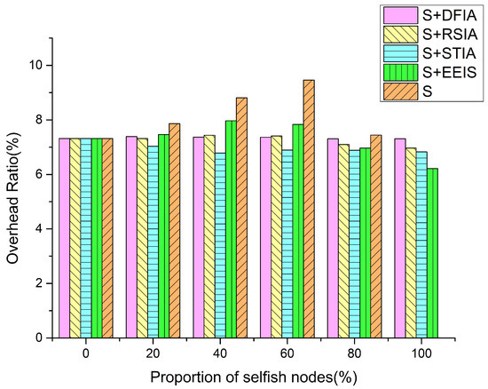 Figure 6 depicts the network overhead in the five scenarios under different percentages of selfish nodes. From the data in the figure, it can be seen that with the increasing proportion of selfish nodes, the network overhead of the other four scenarios, except for S with no incentives, is generally decreasing and changing more stably. In the S scenario, the network overhead decreases sharply when the proportion of selfish nodes exceeds 60%, and it directly decreases to 0 when the proportion of selfish nodes in the network is 100% because there are more and more selfish nodes in the network, and the nodes are not able to relay the messages or successfully deliver the messages to the destination node in the absence of incentive strategies. When the proportion of selfish nodes increases to 60%, the overall network overhead of DFIA is high compared to RSIA, STIA, EEIS, and S with no incentives. This is because DFIA introduces blockchain technology in the use of RSA to encrypt the transaction records, leading to a higher overall network overhead at the expense of higher network overhead in increasing the message delivery probability and ensuring the security of the transaction.