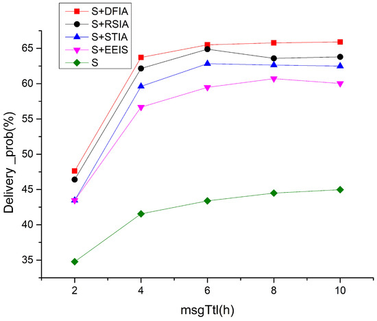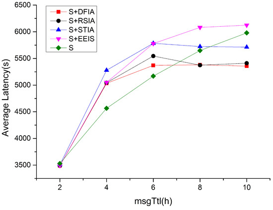 Figure 8 illustrates the average latency of the four scenarios under different message TTLs. It is clear that the average latency increases for all of them as the message TTL increases. An increase in the message TTL means that the messages have a greater chance of being delivered to a greater distance in the network, which, in turn, leads to an increase in the number of packets in the nodes congestion when data forwarding is performed and a consequent increase in the latency of the network. The average delay of these five scenarios has a significant increasing trend with the increase in the message TTL, and the maximum increase in average delay is observed for S, which does not take any incentives. Comparatively, the DFIA, RSIA, STIA, and EEIS have a smaller increase in average latency. Among them, the average latency of DFIA is lower compared to RSIA, STIA, and EEIS, which is due to the fact that although STIA considers the node resources and quality of service, it ignores the node’s social correlation factor, which increases the average latency of the message to a certain extent. RSIA only considers the selfish reasons of nodes, but does not consider the positional relationships between them and distinguishes between strong and weak social correlations, which leads to a higher average latency. EEIS adopts quadratic bargaining and does not consider that the message cannot be transmitted in time due to node packet loss, which affects the average latency. DFIA considers the positional relationships between nodes and introduces the social correlation factor, thereby enhancing the delivery rate of the message and reducing the average latency.