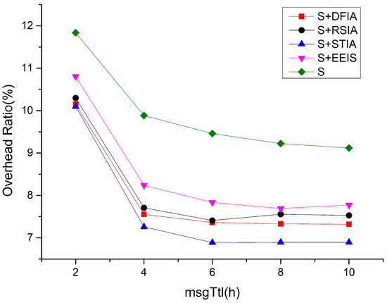Figure 9 illustrates the comparison of network overhead. As the message TTL increases, the network overhead in all scenarios gradually decreases. Since S does not take any incentive measures, its network overhead is higher than that of DFIA, RSIA, STIA, and EEIS. STIA considers the quality of service of the nodes and reduces the message interactions during the bargaining process, thereby optimizing encounter time for message delivery and reducing network overhead. EEIS only considers node resource pricing and uses credit value for monetary lending, and it does not consider the packet loss behavior caused by the decline in transaction capacity due to excessive borrowing and failure to repay, which leads to a high network overhead. DFIA considers node resources, location attributes, and social correlations for the bargaining game, which makes its incentive effect more significant than that of RSIA, and it also has a smaller network overhead. Due to the consideration of multiple factors during bargaining in DFIA, more information interactions are generated, and the network overhead is higher compared to STIA. But DFIA increases the message delivery probability and reduces the average latency, and the overall incentive effect is better than that of STIA.