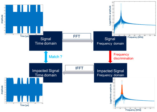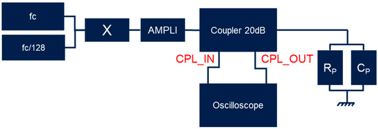 An arbitrary signal generator (AWG) is used to generate modulated or unmodulated frames. An important consideration is the choice of excitation signal. The aim of this step is to determine the frequency characteristics of the chip. Different types of signals can be used to excite the DUT over a given frequency range. However, the excitation signal must necessarily be at a frequency of 13.56 MHz (called fc). This frequency is used to polarize our chip and provide the power needed to bring the chip into an operating state. Additionally, other frequencies are needed to study the chip’s response.