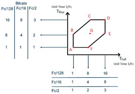 For each bit rate, state transition times, which vary according to RFID communication standards, are also considered. The goal is to encompass the widest possible range, with transition times derived from the standard depending on the bit rate. The study includes a set of rise and fall times that adhere to the specified tolerances, represented as points within a diamond diagram (Figure 2). Each capital letters represent the fall and rise time values between the rising edge and the falling edge of the waveform, for several bit rate.