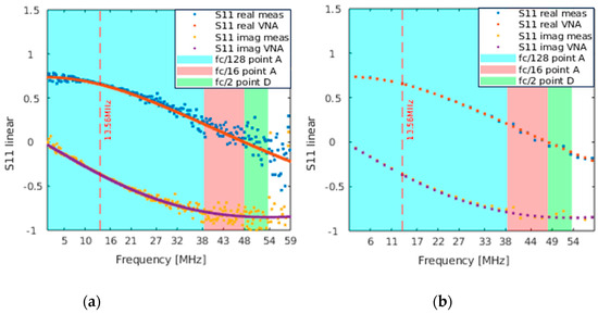 The results obtained using the proposed multifrequency method are presented in Figure 4a. The measurements were taken with a bit rate of fc/128 and a generator setpoint power of 10 dBm. The red and purple curves in the figure represent the real and imaginary parts of the reflection coefficient, respectively, measured using a vector network analyzer (VNA) with a passive component pair. The blue and yellow points in the figure represent the real and imaginary parts of the reflection coefficient, respectively, measured using the proposed method.