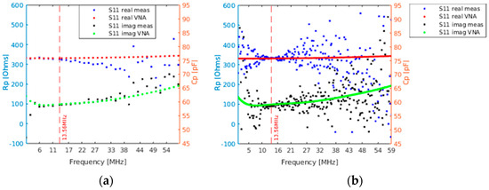 (a) On the left, see the measurements of Rp and Cp for a bit rate of fc/16; the green and red lines represent the references obtained via a VNA measurement. (b) On the right, see the measurements of Rp and Cp for a bit rate of fc/128; the green and red dots represent the references obtained via a VNA measurement.