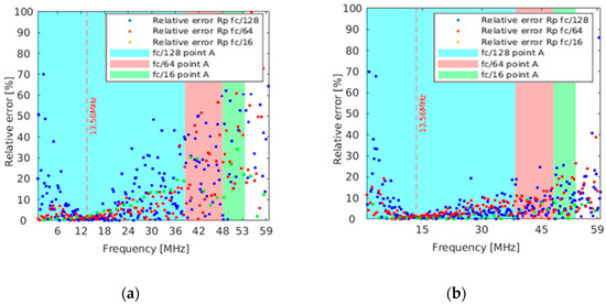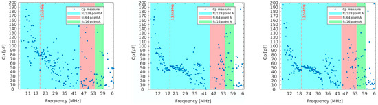 Using the reflection coefficient measurements obtained from the multifrequency method and Equations (1)–(5), it is possible to determine the equivalent component values of a parallel resistor–capacitor pair for all signal frequencies of interest. The results are presented in Figure 5, which shows the impedance of the parallel resistor and capacitor measured for two different bit rates. The left side of the figure corresponds to a bit rate of fc/128, while the right side corresponds to a bit rate of fc/16.