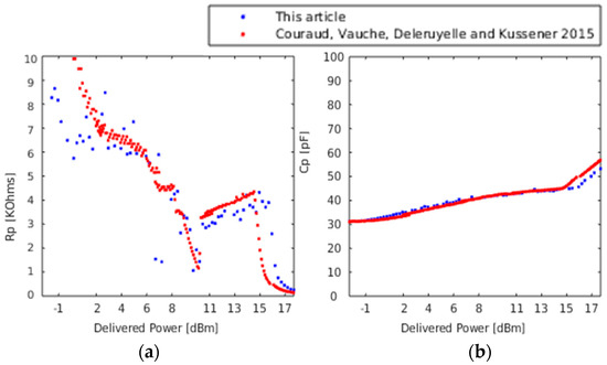 In a second step, this method is applied by considering all the frequencies of interest for each power value. These results are shown in Figure 8 for the parallel resistance value and Figure 9 for the parallel capacitor value.