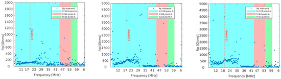 The results obtained from the multifrequency method for characterizing RFID chips show that the variation in parallel resistance as a function of frequency and power supplied by the source is consistent with that observed at a single frequency. However, around a carrier frequency of 13.56 MHz, the resistance decreases rapidly and sharply. This phenomenon can be observed in Figure 8.