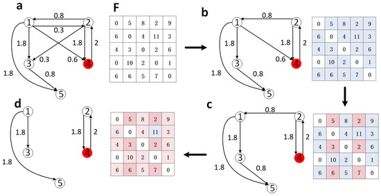 In fact, many connected edges often possess redundant capacity. For example, Figure 1a illustrates a communication network with five nodes. The matrix F represents the information flow transmission demand matrix, where elements indicate the information flow demand that needs to be transmitted from the source to the destination. Each link is associated with its quality attribute [24,25], where the operational level of a link is defined as the ratio of link capacity to link load. Assuming the failure threshold of the link is , if the initial faults in the communication network are links with , these links will be removed from the original network (e.g., remove 1→2, 2→3). At this point, the information flow transmission on the communication link is not affected (links 1→4→2 and 2→1→3 still exist), but links 1→4 and 2→1 are in an overloaded state. The information flow demand on the original link 1→2 will be redistributed to the link 1→4→2. Although the network is not immediately affected and the overloaded links do not fail, the transmission quality will continue to decrease. When increasing the threshold to , the operating efficiency of link 1→4 drops below the critical threshold, causing the edge’s state to change from overloaded to failed, and it is removed from the original network. At this point, 25 information flow transmission demands are affected (highlighted in red in the figure). When the threshold is further increased to , links with are removed. As shown in Figure 1d, only eleven units of traffic demand can be effectively transmitted to the control center. It can be seen that during the process of changing the threshold and removing links, if the overloaded state and the transmission flow demand of the links are not considered, the network will collapse prematurely, leading to significant losses in the power grid.