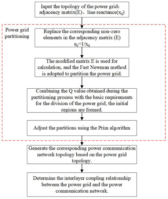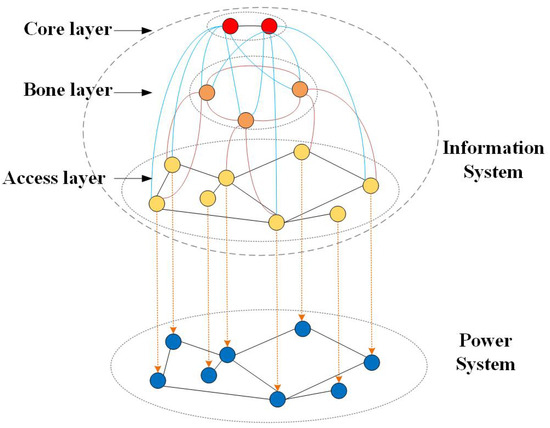 CPPS includes the modeling of the information network, power network, and coupling layer. The information network comprises the access layer, backbone layer, and core layer. The interdependent edges between power nodes and information nodes form the coupling network [27]. In the coupling network, the power network provides power support for the communication network, while the communication network offers 3C support for the power network. However, since communication nodes are widely equipped with backup power sources, the failure of coupled power nodes does not cause the failure of communication nodes due to power outage. The normal operation of power nodes relies on the monitoring and control of communication nodes. The failure of communication links will result in the control center being unable to receive the fault information of the power system in a timely manner, leading to the failure to promptly deal with power failures and expanding the scope of fault impact. Therefore, this paper primarily studies the model of the power network’s dependence on the information network. Referring to the flowchart in Figure 2, the modeling process is detailed as follows: