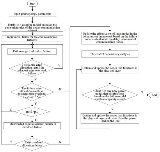 Based on the magnitude of information flow transmission in the communication network, the operational states of links are categorized into three types: normal, overloaded, and failed. To analyze cascading failures between coupled networks, some links in the communication network are randomly removed as initial faults. Referring to the flowchart in Figure 4, the detailed dynamic process of cascading failures triggered by specific damaged links is described as follows: