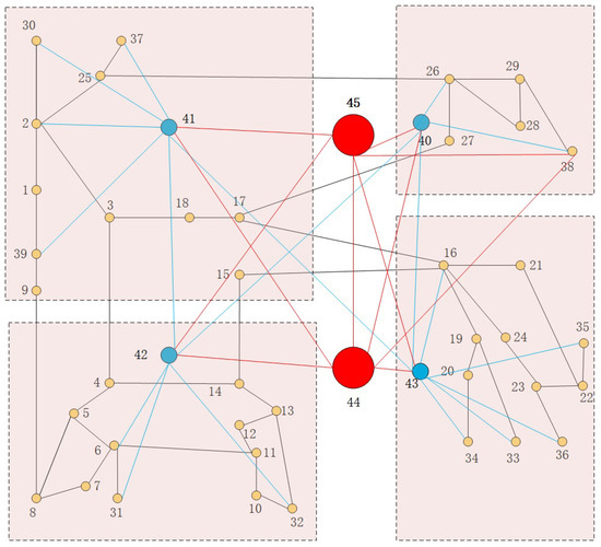 In this section, taking the IEEE 39-bus system as an example, the power network topology is shown in Figure 5 and the original topology is divided into four regions based on zoning principles. Correspondingly, the power communication network, generated according to the aforementioned rules, is depicted in Figure 6. In this network, the access layer consists of 39 communication nodes, each corresponding to one of the 39 power nodes, which are used for uploading fault information and issuing dispatch instructions. The backbone layer includes four control nodes, each corresponding to its respective access layer region. The dispatch center is equipped with two control nodes.