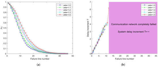 Figure 7b shows that the CPPS under different overload coefficients exhibits a first-order percolation transition, with a similar overall trend. As the number of failed lines increases, the topology of the information layer is disrupted, and some nodes lose their data transmission paths. Changing the transmission path increases the system delay. When the overload coefficient is 1.5, the number of failed links that the communication network can withstand before complete collapse is the highest. As seen in Figure 7b and Table 1, there is a threshold for the initial number of failed links, near which the cascading failure effect expands to all communication links, leaving no transmission path between communication nodes and the control center. At this point, the communication system completely fails, making it impossible to control the power grid. Table 1 shows the specific thresholds for different overload coefficients.