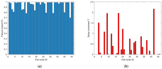As shown in Figure 8, it can be observed that the failure of a single communication link can reduce the node and link survival rate in the communication network to as low as 69.69%, induce a system delay increment of 2.1635, and cause a 35.07% paralysis in the nodes and links of the power network. It is also noted that some link failures do not affect the rest of the communication and power networks beyond the faulty link. This is because, in cascading failures, the communication network considers the congested state of the links, redistributing the traffic on failed and overloaded links. Moreover, overloaded links can sustain operation for a short period before failing, thereby enhancing the system’s robustness to some extent. Furthermore, the communication link that causes the maximum delay increment may not necessarily result in the lowest node/link survival rate in the communication network or the highest failure rate in the power network nodes/links. However, the failure rates of nodes/links in the communication and power networks are notably similar. For example, when link 42 fails, the highest delay increment of 2.1635 occurs. At this point, the survival rate of communication nodes/links is 98.91%, and the failure rate of power nodes/links is 3.46%. This is because the failure of link 42 changes the path from communication node 27 to the control center, from the original path 27→26→40→44 to 27→17→16→43→44, resulting in communication delay. The failure rate of communication node 27 is 36.06%. However, removing link 42 does not cause failure or overload in other links, so there are 45 operational links, and the number of effective communication nodes remains unchanged compared to before the fault. Due to the coupling relationship, the failure rate of power node 27 is also 36.06%, ultimately leading to the failure of power node 27.