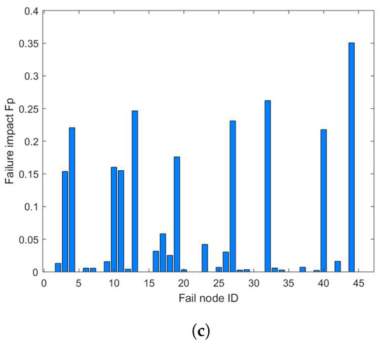 The impact of initial faults on the cyber–physical system. (a,b) show the impact of each communication link failure on the robustness and delay increment of the communication system, while (c) shows the impact of each communication link failure on the physical power grid.