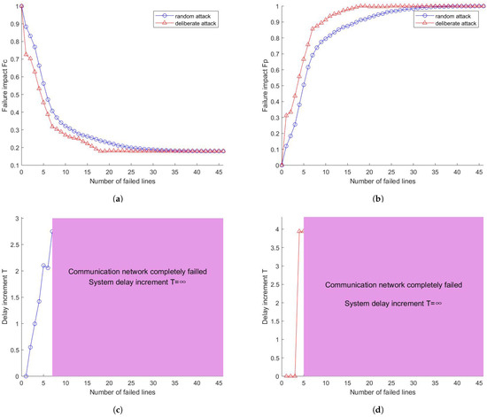 Impact of attack strategies on cyber–physical system. (a–d) illustrate the relationship between the evaluation metrics of the coupled network and the number of failed communication links under two different attack strategies (random attack and deliberate attack). Specifically, (a) shows the relationship between the survival rate of nodes/links in the power communication network and the number of failed communication links, (b) shows the relationship between the failure rate of nodes/links in the power communication network and the number of failed communication links. (c,d) respectively depict the trend of delay increment in the system under random attack and deliberate attack.