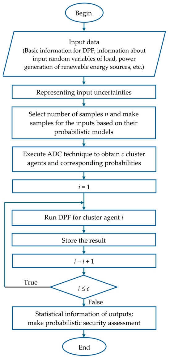 The flowchart of the proposed approach, i.e., the advanced data clustering-based probabilistic power flow (ADCPPF), used for probabilistic security assessment is shown in Figure 1. In the flowchart in Figure 1, the main part that helps significantly improve the calculation time is in the ADC block.
