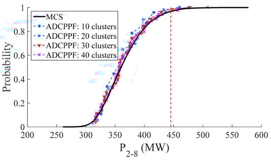 As discussed in Section 2.1, K-means clustering can be very time-consuming with large datasets due to the poor scalability problem. Different from K-means, the K-means-lite approach was developed in [] and can give the results very quickly. Its accuracy has also been shown to increase in comparison with the K-means technique. Therefore, in this test, we do not focus on proving the accuracy of the ADC method compared to the K-means method. Instead, the processing time performance is focused on, thereby indicating that the proposed approach has good applicability for solving problems in the time frame of power system operation. It is clearly shown in Table 3 that the ADCPPF approach can give the result in a few seconds, in comparison to the hundreds of seconds needed by MCS. In particular, as previously mentioned, for a dataset including n data point, K-means clustering needs an amount of time equal to O(nkT) to run (in which T is the number of iterations). The running time of K-means will sharply increase with an increasing n and/or k. The modified IEEE 300-bus system is a large-scale system, so K-means-based PPF runs very hard and takes a long time.