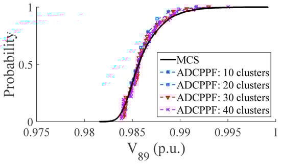 PPF computation is performed to achieve all results of interest of the output RVs in terms of PDFs and/or CDFs. For the purpose of illustration, the distributions of a number of selected output RVs are shown. Figure 2 plots the CDFs of real PF through branch 2–8 (i.e., denoted as P2–8), while that of the voltage at bus 89 (i.e., denoted as V89) is given in Figure 3. It can be seen from the figures that the developed ADCPPF approach can match well with the curves from MCS, indicating the good performance of the ADCPPF approach.