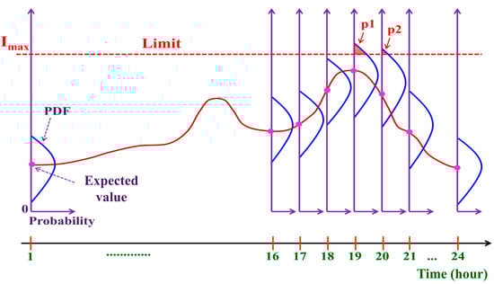 For example, in Figure 4, from 16:00 to 18:00, the current gradually increases and, near 19:00, the upper boundary of the PDF line begins to touch and surpass the limit Imax and the calculated probability that corresponds to 19:00 is p1. It should be noted that, as the evening approaches, the solar power source gradually decreases, and in this example, by 19:00, this source no longer generates power. However, this is the peak period in the system where the load increases rapidly until reaching the peak. At this time, the uncertainty in the system comes from the loads and other sources, if any, and not from the solar power source. Then, at 20:00, the current tends to decrease and the level of intrusion has a value of p2. Thus, in the above case, it can be roughly considered that the risk of overloading lasts about 1 h. The overload time can be estimated more accurately if the calculation time-step is smaller (30 min, 15 min, etc.), and this depends on the capabilities of the forecasting technique as well as the requirements of the system operator. If the period of risk of overloading lasts long but is still within the allowable limit, then the overload is considered a temporary overload and does not require any intervention. On the contrary, when there is a risk of overloading for a long period of time and the level of overload is severe, the operator must come up with suitable solutions to ensure security for the system.