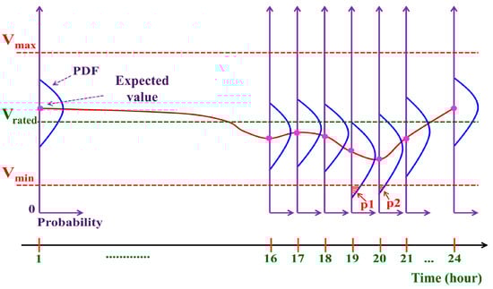 Figure 5 is an illustrative example of assessing the risk of over-/under-voltage at a bus of interest. In this example, the risk of under-voltage at times 19:00 and 20:00 is calculated as p1 and p2, respectively.