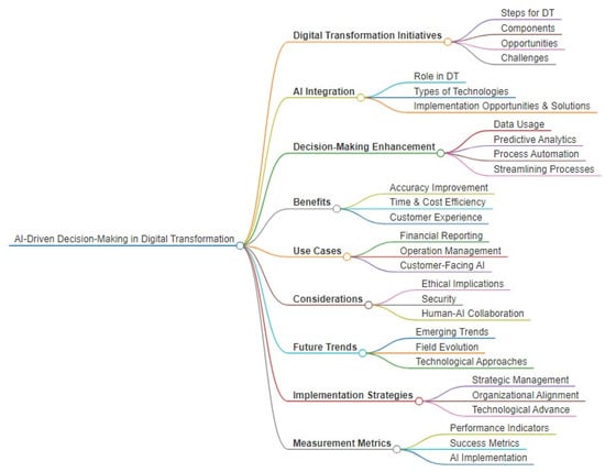 Figure 1 shows AI-driven decision-making in digital transformation. This includes digital transformation initiatives, AI integration, decision-making enhancement, benefits, use cases, consideration, future trends, implementation strategies, and measurement metrics. Each of these directions is important in the evolution of digitization. Evaluating each direction, the following can be stated: