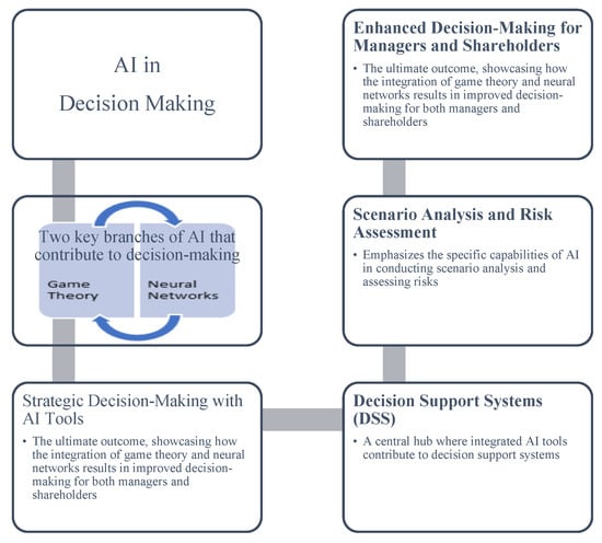 This conceptual map (Figure 2), provides a visual representation of the interconnected concepts, illustrating how game theory and neural networks, when integrated into decision support systems, contribute to strategic decision-making processes and enhance overall decision quality for stakeholders [21]. The combination of game theory and neural networks can be particularly powerful. Neural networks can analyze data to inform decision-makers about the likely outcomes of different strategies, while game theory can help model the strategic interactions and competitive dynamics among stakeholders. By leveraging neural networks to analyze historical data and predict outcomes, decision-makers can use game theory to optimize their strategies based on a deeper understanding of the competitive landscape. AI, including game theory and neural networks, can be integrated into decision-support systems that provide actionable insights to managers and Shareholders.