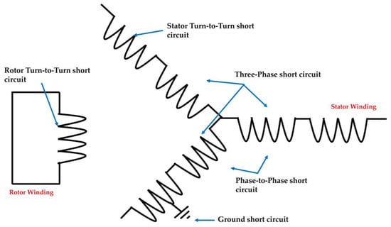 Electrical faults in stator windings are crucial to the performance and reliability of synchronous generators. These faults can be categorized into several types, each affecting the generator differently. Figure 1 illustrates the various types of faults in the stator windings, specifically showing turn-to-turn short circuits, ground faults, and phase-to-phase short circuits within a three-phase coil system.
