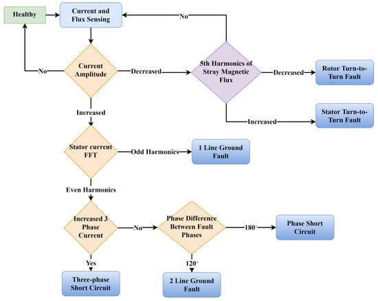 Various diagnostic methods have been developed to detect these faults. Impedance measurements are widely used to identify stator winding faults by analyzing frequency-dependent impedance variations [4,5]. However, impedance measurements can be affected by changes in operating conditions and external noise, which can lead to inaccurate fault detection. To address these challenges, several improvements have been made to the measurement methods [6,7]. Despite these advancements, they still require complex and precise equipment, such as impedance analyzers, network analyzers, and high-performance probes. They are also sensitive to contact resistance and can be influenced by temperature changes. Moreover, they may not effectively capture faults that occur only at specific frequencies, necessitating a comprehensive analysis across a wide frequency range. Temperature monitoring is another common method for detecting overheating caused by electrical faults [8,9]. However, since temperature changes may occur gradually, this method is less effective for early detection. Vibration analysis, typically used for detecting mechanical faults, relies on measuring vibrations to identify issues such as misalignments or bearing failures. This method requires precise sensors and can be influenced by external vibrations and noise, limiting its effectiveness for electrical fault detection. Although vibration-based fault diagnosis is commonly applied, it increases costs due to the need for sophisticated sensors and analysis tools [10,11]. Therefore, there is a need for diagnostic methods that can identify multiple faults with minimal costs, enhancing real-time condition monitoring, reducing maintenance expenses, and increasing system efficiency.