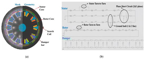 Schematic representation of the synchronous generator used in the simulation: (a) cross-sectional geometry and mesh of the generator showcasing the arrangement of components; (b) detailed electrical circuit layout used for simulating various fault conditions.