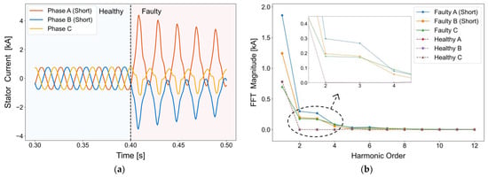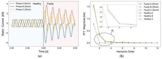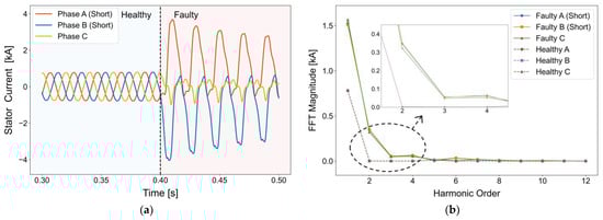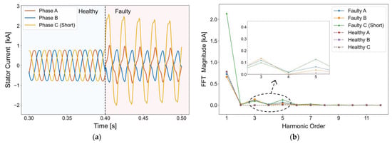 Simulation Results of a Phase Short Circuit: (a) Stator currents of three-phase; (b) FFT Analysis of Stator Currents.