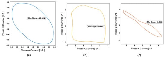 This type of fault causes an increase in the current magnitudes of the affected phases and a rise in even harmonics, creating a pattern similar to that of two-line ground faults. Due to these similarities, the accurate identification of the fault requires distinguishing between the different phase differences. This can be effectively achieved by analyzing the Lissajous curves. Figure 9 shows the Lissajous curves for the healthy condition, a two-line ground fault, and a phase-to-phase short circuit. The minimum slopes of each Lissajous curve are −46.013 for the healthy condition, −674.683 for the two-line ground fault, and −6.065 for the phase-to-phase short circuit.