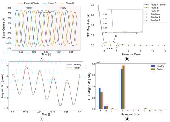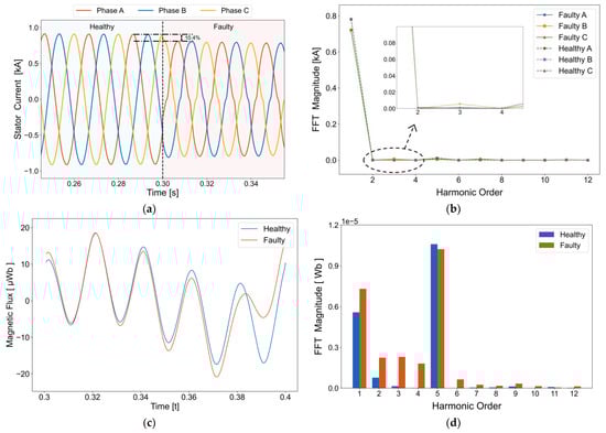 Simulation Results of a Stator Turn-to-Turn fault: (a) Stator currents of three-phase; (b) FFT Analysis of Stator Currents; (c) Magnetic Flux of Stator; (d) FFT Analysis of Stator Magnetic Flux.