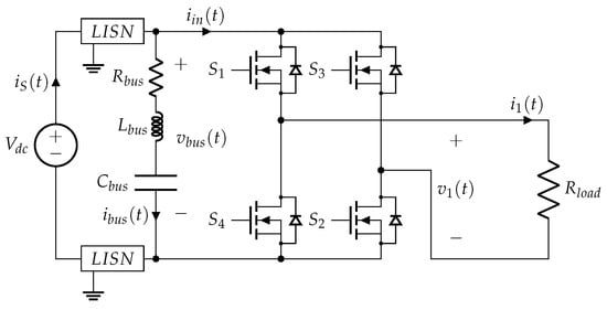 The considered power converter is an H-bridge inverter with GaN MOSFETs as switches. The equivalent circuit of the considered system is shown in Figure 1 for a generic resistive load and in Figure 2 considering the complete WPT system.