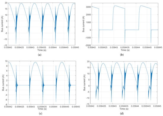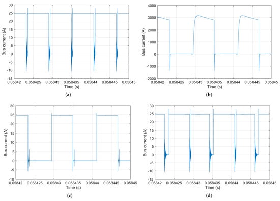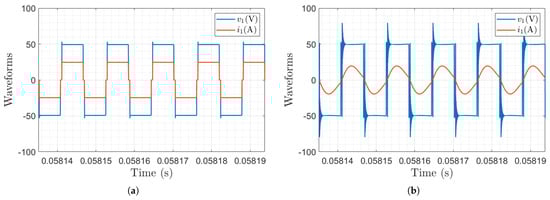 For a resistive load, the reference is represented by the square waveforms and , shown in Figure 4a with the corresponding spectra of and shown in Figure 5a. The voltage presents spikes due to dead times, which are necessary, however, to allow adequate protection against shot-through. The bus voltage and input current have more populated spectra with respect to the ideal one (DC voltage current), which still presents the fundamental component at 2.
