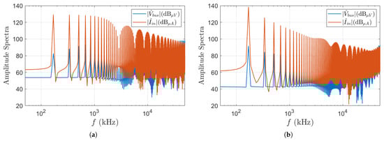 In the case of the WPT system, voltage and current waveforms and are shown in Figure 4b and the spectra of the corresponding and are shown in Figure 5b. In this case, the voltage spikes are much more pronounced, due to the resonance they trigger (during the dead time the resonant circuit is left in high terminating impedance conditions).
