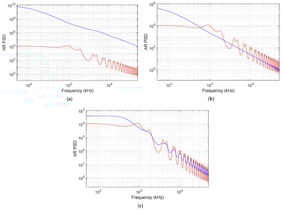 Comparison among the estimated AR power spectral densities in the different conditions for the H-bridge inverter with resistive load. The reference (healthy) AR PSD (red) is compared with the AR PSDs estimated in faulty conditions (blue): (a) healthy vs. short circuit; (b) healthy vs. open circuit; (c) healthy vs. asymmetric input voltage.