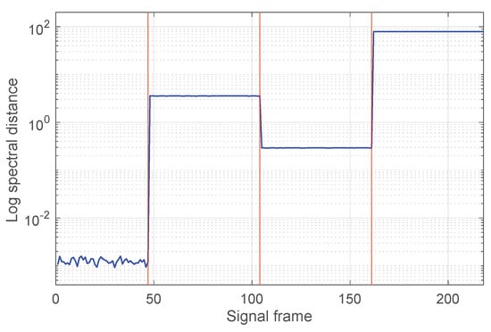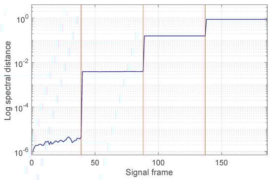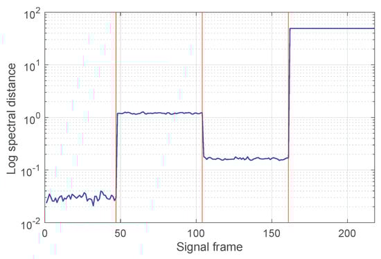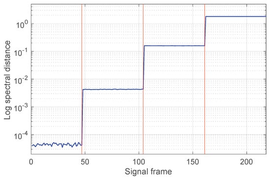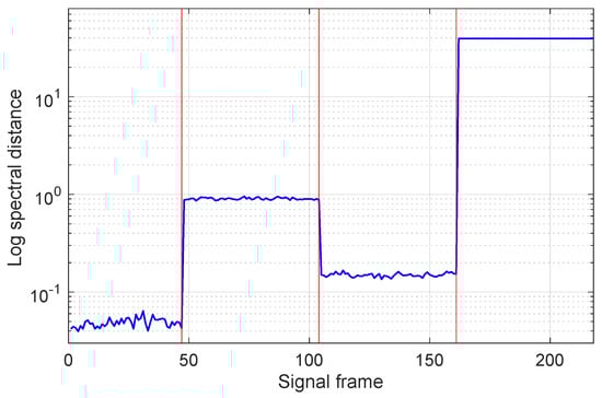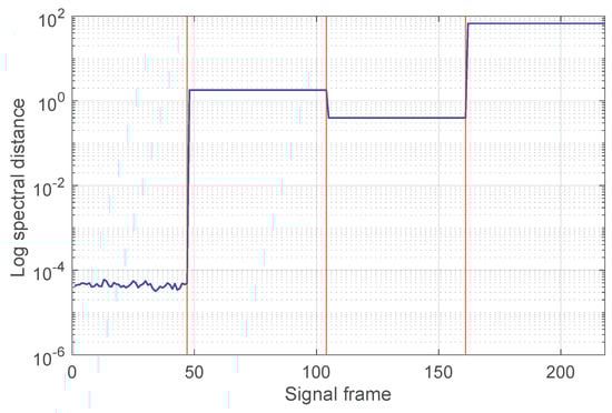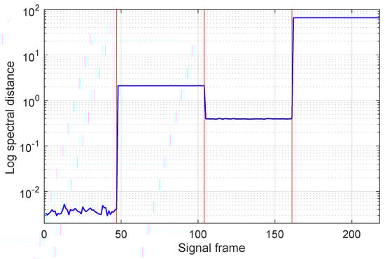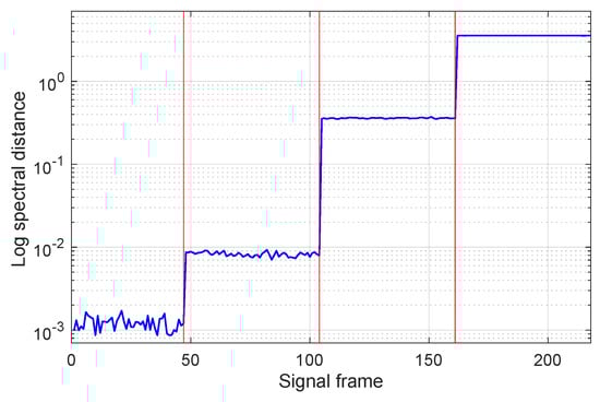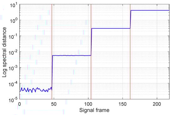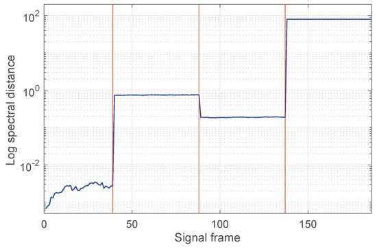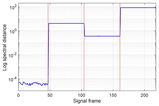 Evolution of the log spectral distance (LSD indicator) computed from the AR PSD in the presence of additive noise with in four different conditions (in the case of resistive load). From left to right: healthy, , , and open circuit. AR models estimated from the bus voltage . The red lines indicate the different signal segments (frames) of N samples corresponding to the four different conditions.