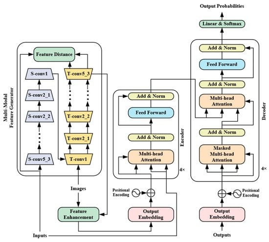 In this study, we directly adopted the encoder and decoder of the transformer [37]. They are based on a novel dual-level interactive multimodal rogue encoder that integrates multiple modalities. This encoder can extract valuable visual features to enhance text-level machine translation. Based on the target sentence , our framework generates the predicted probability of the target word as follows:
