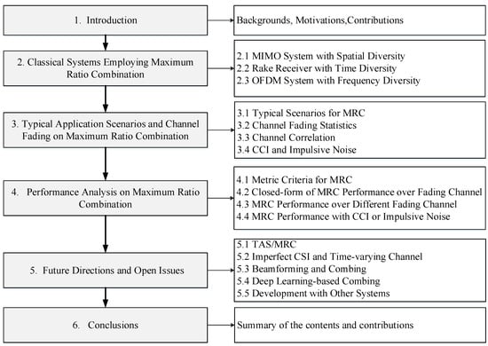 The remainder of the paper is organized as follows. Section 2 presents the application framework of MRC in multi-channel communication systems, i.e., MIMO, Rake receiver and OFDM. Section 3 introduces typical MRC application scenarios and analyzes the influential factors including channel fading statistics, CCI and impulsive noise. In Section 4, the performance metrics and performance analysis for MRC over typical channel fading scenarios are analyzed and summarized. Section 5 analyzes possible development directions and open issues considering the emerging MRC or MRC-aided wireless systems. In Section 6, conclusions are made.