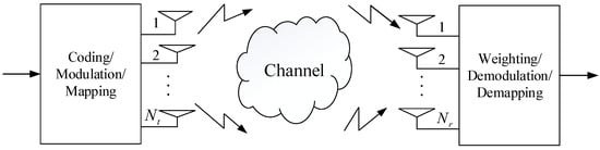MIMO systems are implemented by equipping multiple antennas at the transmitter and receiver. The MIMO system shows high potential in communication reliability and high data rate [21]. A typical MIMO system is shown in Figure 2. In Figure 2 antennas and antennas are equipped at the transmitter and the receiver end, respectively. The data are transmitted through the dimensional MIMO channel.