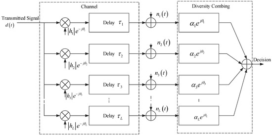 The multichannel signals suffer from multipath fading, external noise and interference. To mitigate the effects of multipath fading and interference, many researchers have studied how to choose the combined weights for performance and capacity improvement. MRC is still a powerful competitor compared with other combining strategies. MRC achieves diversity gains by utilizing the multichannel data according to the linear combining rule. To facilitate the analysis in this paper, the multichannel system model from the spatial diversity system is adopted to illustrate the principle and scenarios of MRC as shown in Figure 4. The model includes a single primary user with one antenna and a receiver equipped with L diversity branches. For the lth subbranch, signal passes through channel with path amplitude , time delay and suffers noise . At the receiver end, the combing weight for the lth antenna is . In this section, typical scenarios are first presented, i.e., Gaussian noise-limited scenario, CCI-limited scenario as well as impulsive noise-limited scenario. Then, the statistics of multipath fading channels are elaborated.