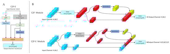 - The C2F-E module is designed and employed to reconstruct the backbone network using the gradient path design strategy and the ELAN structure. The introduction of more enriched feature extraction levels not only reduces the parameters and computational load of the backbone network but also enhances the overall detection performance of the model.