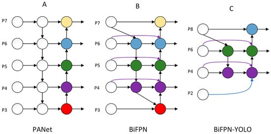Different feature fusion network structures: (A) model proposed in the PA-Net paper; (B) model proposed in the EfficientDet paper; (C) structure used in this paper.