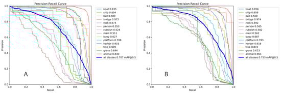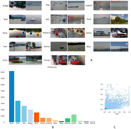This study utilized the WSODD dataset for training and testing. The dataset was captured by Hikvision industrial cameras and comprises 7467 images with a total of 21,911 examples. The dataset encompasses 14 distinct categories of images, such as ships, boats, balls, bridges, rocks, humans, trash, masts, buoys, platforms, harbors, trees, grass, and wildlife. Ships constitute more than 30% of the dataset, which is accessible on GitHub. The images were split between a training set and a validation set following a 72:28 ratio, with 5402 images allocated for training purposes and 2065 for validation. An assortment of sample images from the dataset is showcased in Figure 6A.